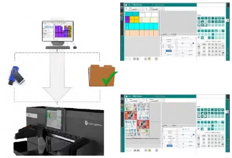 Con el software opcional CutTronic, los datos CIP3/4 generados en preimpresión se importan y traducen en programas de corte. CutTronic Plus le ofrece ventajas adicionales: aquí, los datos CIP3/4 existentes pueden editarse externamente y adaptarse perfectamente al flujo de trabajo. La transferencia de datos a la máquina puede realizarse de tres formas distintas: mediante USB, Ethernet o conexión inalámbrica. CutTronic Plus le ofrece flexibilidad en el flujo de trabajo.