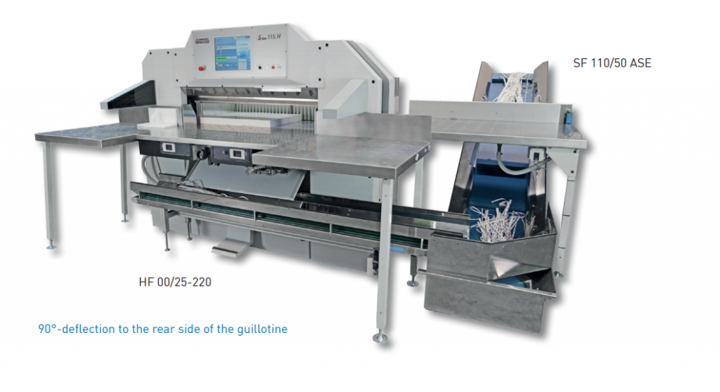 - Eliminación automática de residuos con un sistema de transporte de residuos BUSCH que se coloca debajo del conducto de desechos de la mesa frontal de guillotina