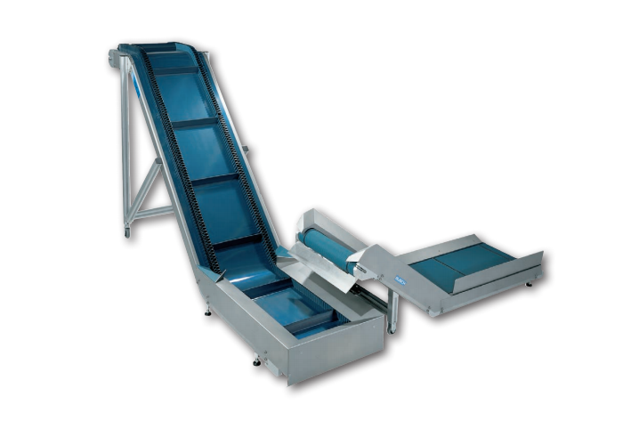 – La cinta transportadora está fabricada en material plástico elástico (PVC) con canto ondulado en ambos lados y con tacos de transporte