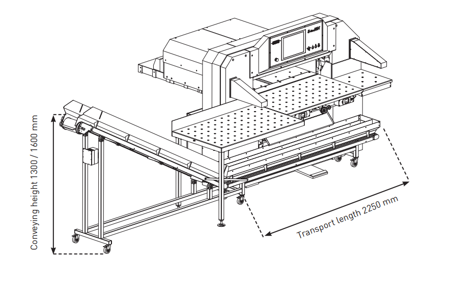 Se ofrece alternativamente el transportador de residuos SF en línea (un elemento) con un ancho de transporte más estrecho. Instalado a la izquierda o derecha directamente de la guillotina.