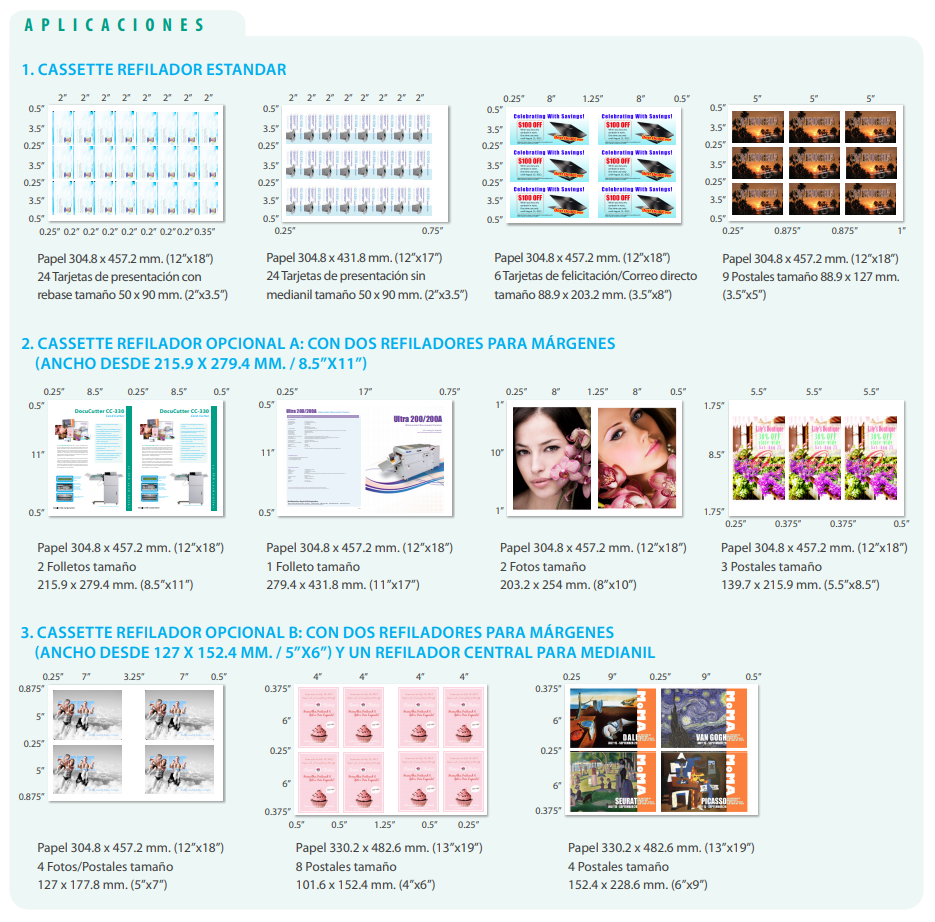 La CC-330 es una solución de acabado para gran variedad de producto impreso digitalmente a color: Tarjetas de visita, postales, tarjetas de felicitación, fotografías…en una amplia gama de tamaños de papel.
