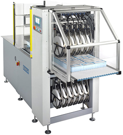 Con 4-6 estaciones de precintado de serie y hasta 12 estaciones como opción, con ajuste central. El material de las bandas es cinta de polietileno o cinta de papel kraft.