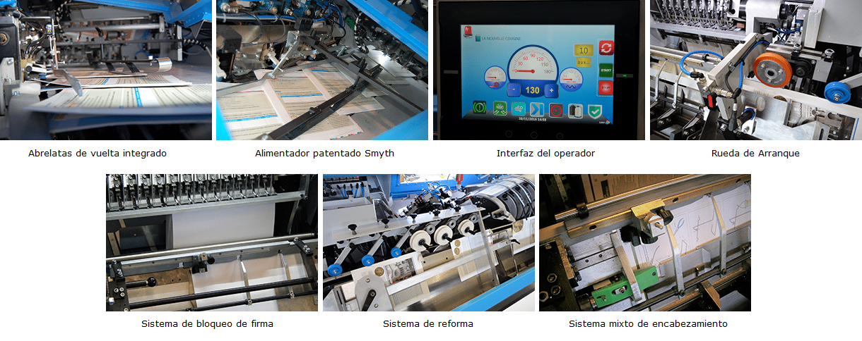 El sistema mixto de vacío y presión facilita la transferencia de la signatura desde la montura al cabezal de costura utilizando un mecanismo de elevación de tipo Venturi. Este mecanismo garantiza además la correcta transferencia de todos los tipos de signaturas al cabezal de costura.