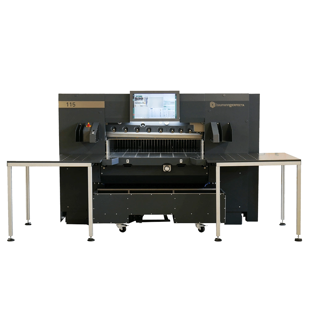 Las guillotinas de alta velocidad BaumannPerfecta incorporan un diseño moderno enfocado en funcionalidad, ergonomía y seguridad. Destacan por su pantalla inclinable de gran tamaño y el nuevo control CUTPIT, que facilitan el manejo. Incluyen una célula de corte con sistema de amortiguación que prolonga la vida útil de la cuchilla. Su diseño modular permite integrarlas con periféricos para formar sistemas de corte totalmente automáticos.