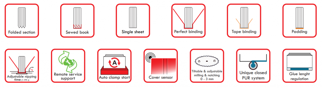 La boquilla PUR consiste en dos órbitas circulares con una apertura en cada uno. Cuando el sensor, cerca de la boquilla, detecta el bloque del libro  la apertura de ambas órbitas se alinea y se aplica la cola PUR de forma precisa. Cuando el bloque del libro se separa del sensor la apertura del interior de la órbita se mueve y sella la cola PUR. La boquilla interior apaga o inicia la cola PUR con extrema rapidez y precisión manteniendo una presión constante y alta calidad.