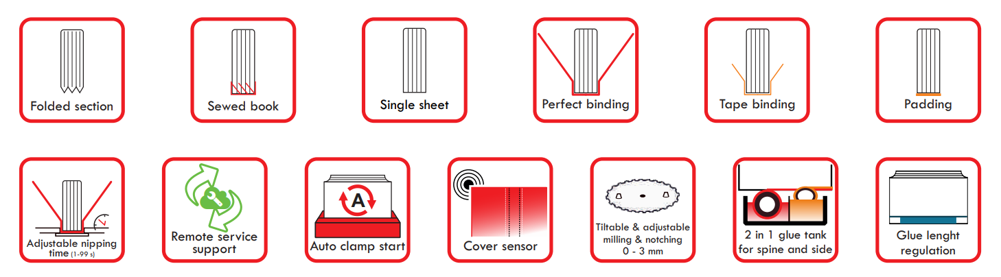 La encuadernadora semiautomática Millbind 420 Hot-Melt es miembro de la familia de productos Millbind y tiene todas las funciones necesarias que requiere una imprenta de tamaño medio. La máquina está equipada con cuchillas de corte especiales montadas en un disco de fresado de precisión que proporciona la preparación óptima para la superficie de encuadernación.