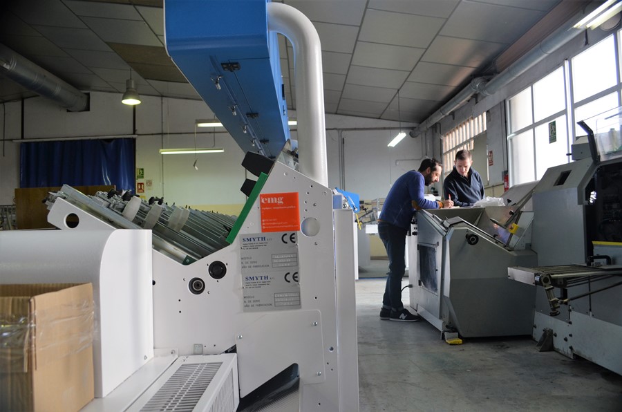 Tras el éxito de la primera máquina de coser automática Smyth F180 4D instalada en 2006, Rueda recientemente renovó su confianza en Smyth S.r.l, de la mano de Equipos y Maquinaria Grafic, S.L. (emg), con la compra e instalación de la línea de alzado de pliegos y cosido integrada automática Smyth UNIT para gestionar las diversas necesidades y toda la producción de bloques de libros cosidos de la compañía.