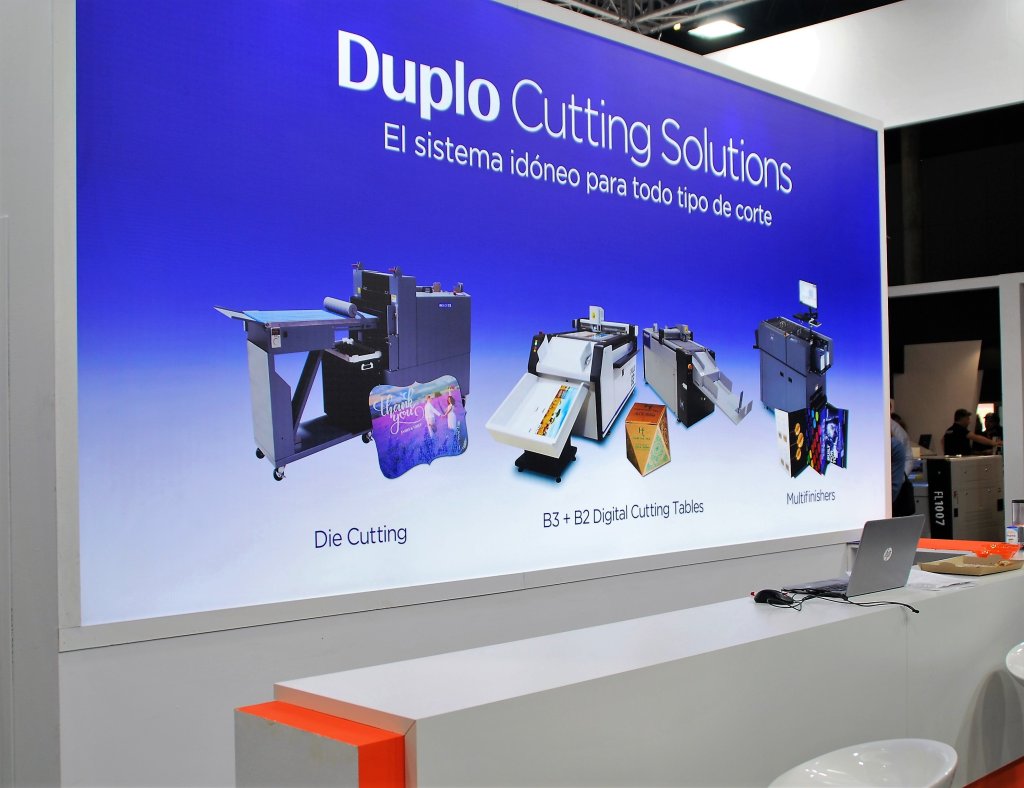 Para estos paneles, escogimos diseños promocionales de equipos Duplo, marca que EMG distribuye en España de manera exclusiva. El primero se dedicó a las diferentes soluciones de corte de su gama, representadas en el stand con PFi Blade B2+ y la multifinisher DC-618. Dos equipos con los que se hicieron numerosas demostraciones que atrajeron el interés de muchos visitantes.