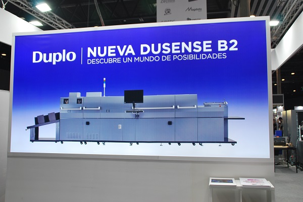 El segundo de los paneles acogió la potente imagen de la última novedad de Duplo, la DuSense B2, un equipo que abre nuevas capacidades tanto en formato de papel como en la gama de efectos de barniz con relieve de alta calidad. Un acabado sorprendente que también pudimos mostrar con la presencia de una DuSense en una posición destacada de nuestro stand. El proceso de aplicación del Barniz UV con reserva fue otra de las demostraciones que concentraron mayor atención.