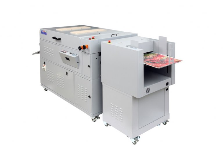 La versión UV&AQ permite la aplicación de barnices en dispersión (base agua) así como barnices estándar. Está equipado con alimentador de succión SF300, de hasta 200 mm de altura, manejando una gran variedad de materiales. Opcionalmente se puede equipar con un alimentador y apilador de alta capacidad (hasta 750 mm) y un sistema de volteo de hojas, que gira automáticamente las hojas para barnizado dúplex.