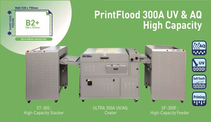 PrintFlood 300A UV o AQ ofrece una velocidad de producción de hasta 45m/m y maneja papel en diferentes tamaños: desde 215 mm (W) x 280 mm (L) hasta 530 mm (W) x 750 mm (L).