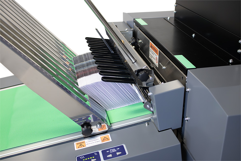 • Utiliza el apilador de tarjetas o, para tiradas más largas, desvíalas a través de la plegadora y utiliza el apilador completo de 400 tarjetas.