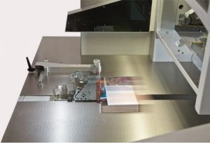El uso de cuchillas laterales extendidas, una placa de recorte ampliada y un dispositivo de sujeción específico permite procesar grandes formatos de hasta 350 mm x 500 mm. Mesa auxiliar para extensión de mesa frontal. Con la ayuda de una mesa auxiliar móvil, los productos pueden transportarse, estacionarse o almacenarse. Esto ofrece más espacio de trabajo y almacenamiento .