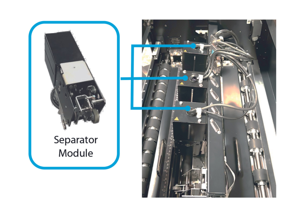 La unidad separadora DSM-SP elimina los residuos que rodean al producto final, lo que se conoce como «blanking». Los residuos se depositan en un contenedor situado debajo de la unidad apiladora. La DSM-SP viene de serie con 7 módulos separadores. Esto permite separar los trabajos más complejos sin necesidad de troqueles de separación adicionales. Hay algunos casos en los que la DSM-SP se puede utilizar para eliminar los residuos internos, como una ventana recortada. Esto se denomina «stripping». Esto puede reducir la necesidad de eliminar este residuo manualmente. No es necesario el costoso troquel de eliminación.
